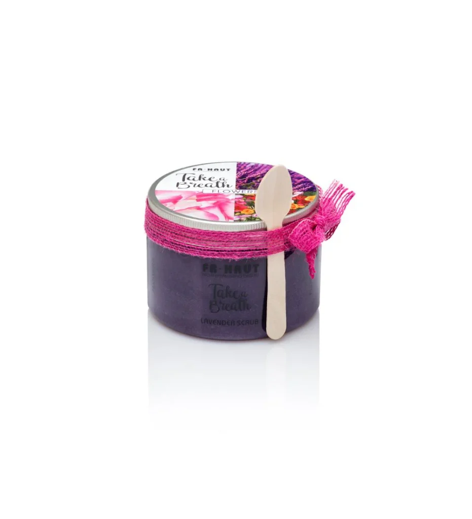 Aromático peeling corporal, con una base de sal, azúcar,aceite de lavanda y semilla de uva, que relaja, depura e hidrata la piel en profundidad.